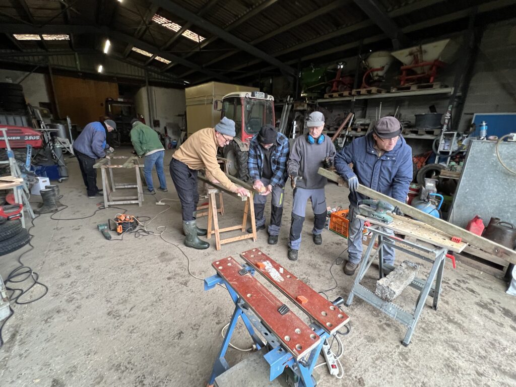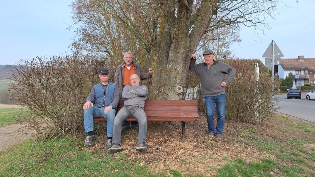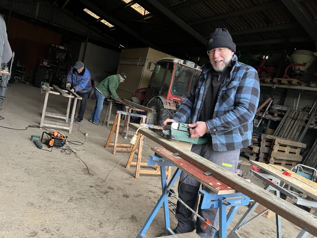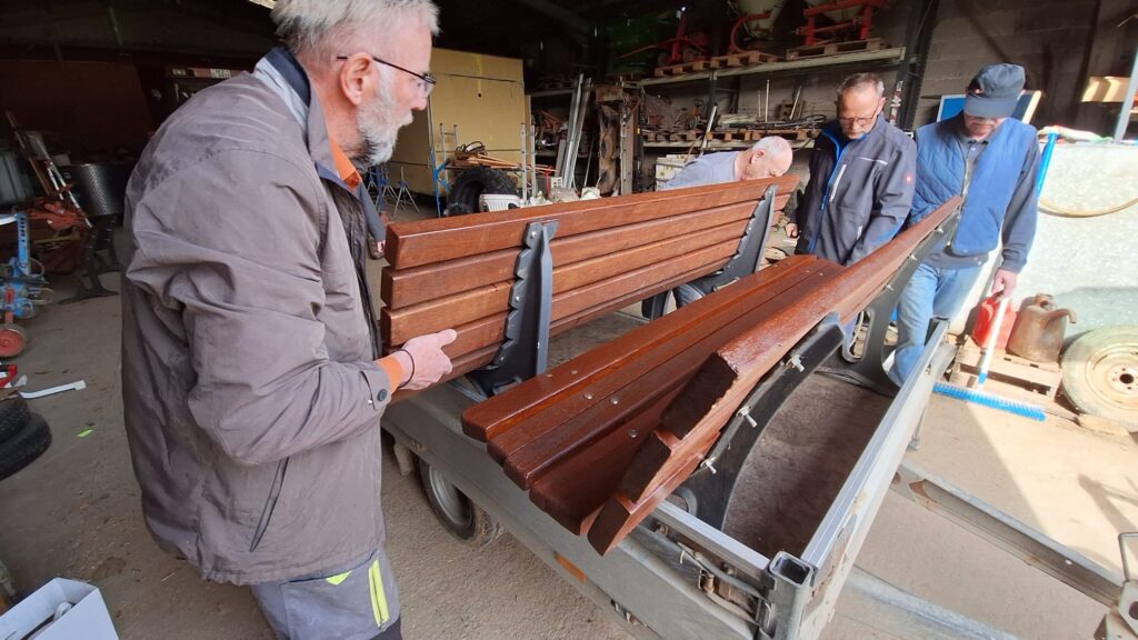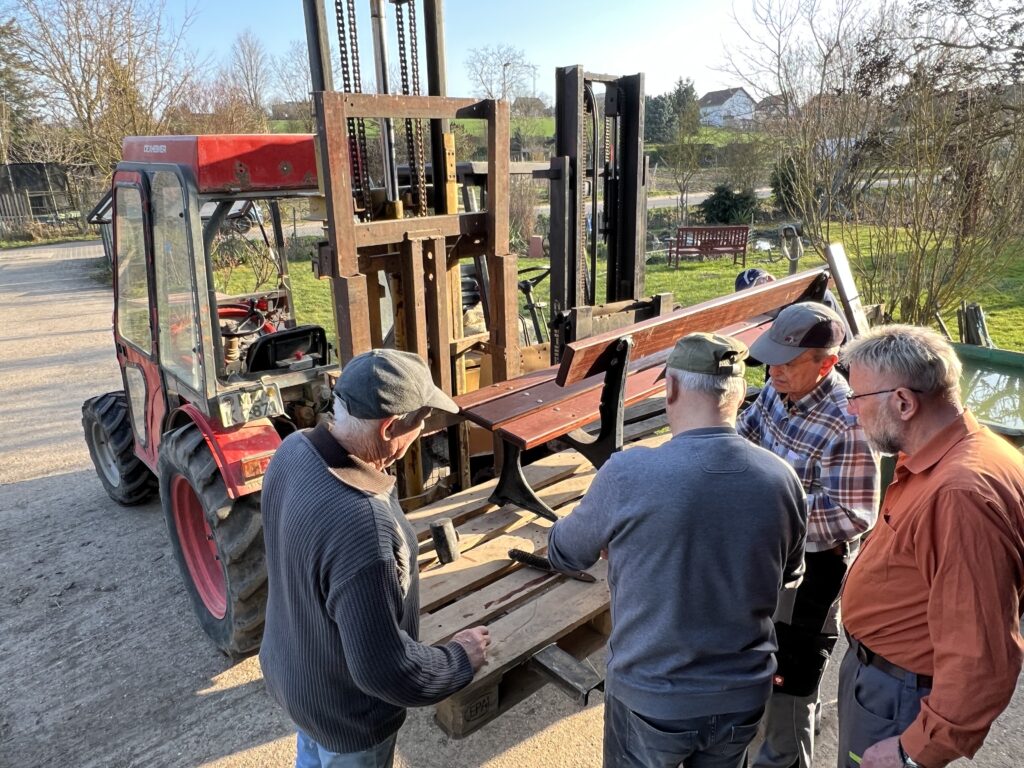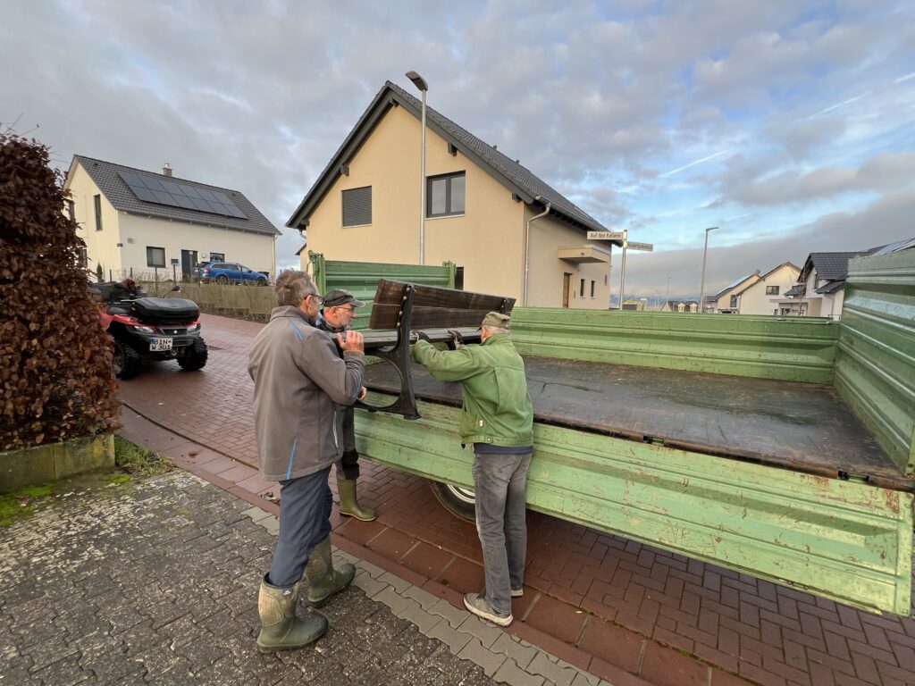 Gesagt, getan! Gegen Ende des letzten Jahres fuhr ein Team mit Traktor und Hänger am Friedhof vor. Die renovierungsbedürftigen Bänke wurden schnell identifiziert – sechs Stück an der Zahl – und mit vereinten Kräften auf den Hänger geladen. Auf der Fahrt zur Landwirtschaftshalle, die zur Trocknung und Bearbeitung der Bänke vorgesehen war, kamen wir an der Sitzbank Ecke Ausfahrt Taunusblick vorbei: ebenfalls verwittert, also rauf auf den Hänger!