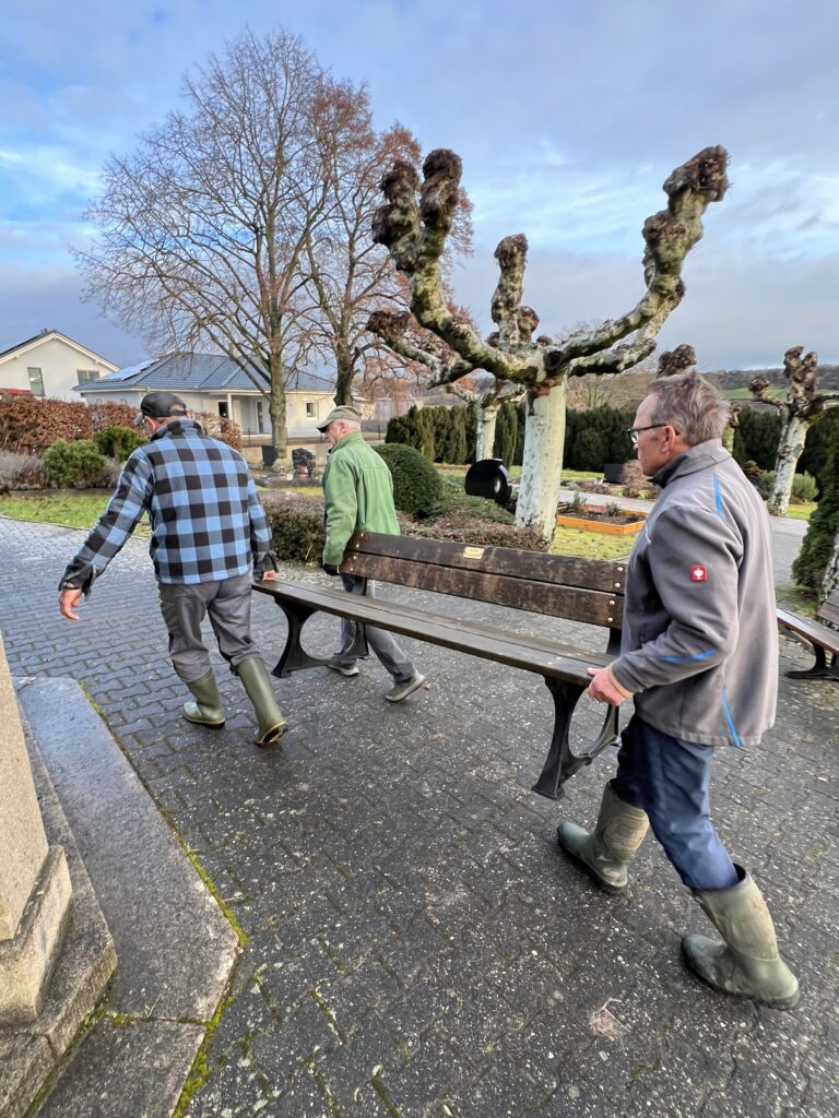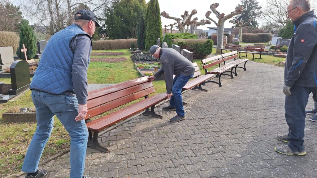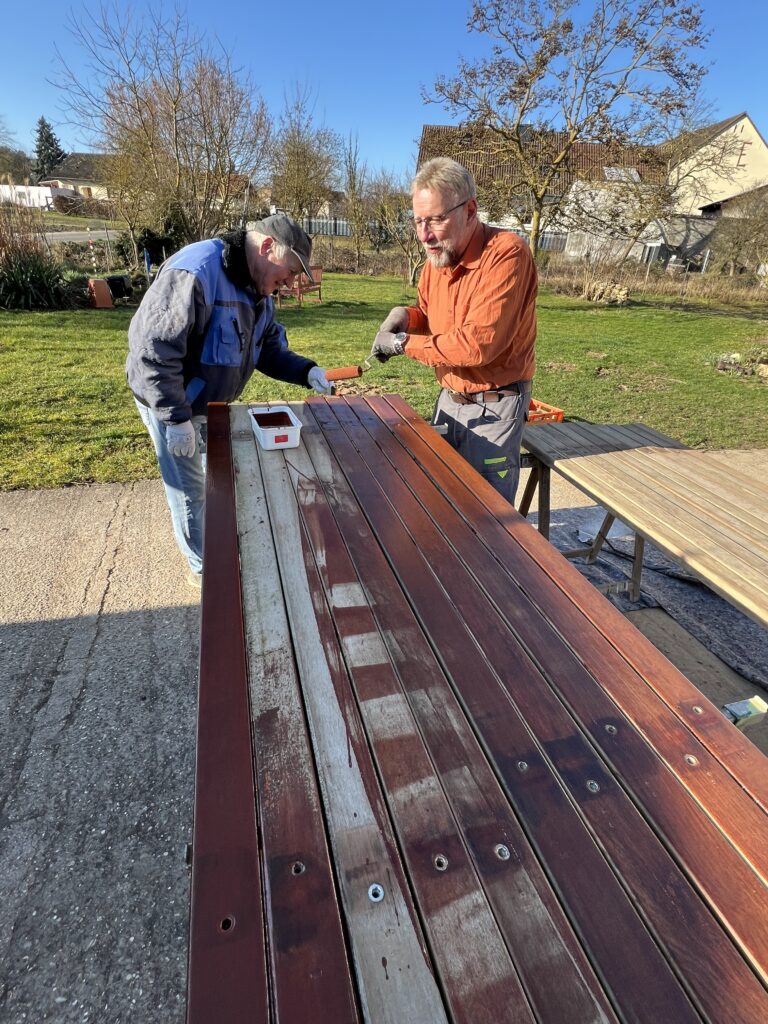 Mit dieser Idee im Kopf setzte er sich mit seinen Freunden der Gruppe „Liebenswertes Appenheim“ zusammen und schnell waren wir uns einig: wir holen die Bänke vom Friedhof, bauen sie auseinander, schleifen die Holzplanken und streichen sie mit einer witterungsbeständigen Lasur – ein Projekt für die Winterzeit.