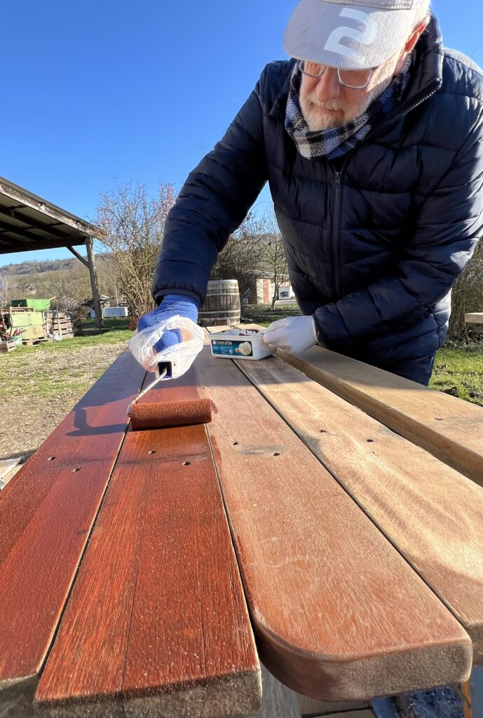 Anfang März hatte die Sonne ein Einsehen, die ersten angenehmen Temperaturen ließen uns wieder an der Halle zusammenkommen. Jetzt waren Pinsel, Farbroller und Mahagoni-Lasur gefragt.
