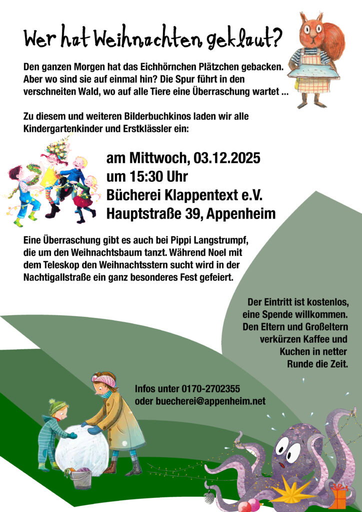 Wir freuen uns auf das nächste Bilderbuchkino zum Thema Weihnachten am 3. Dezember. Vorlesen mit Bildern, Kaffeetrinken und Bastelaktion inklusive.